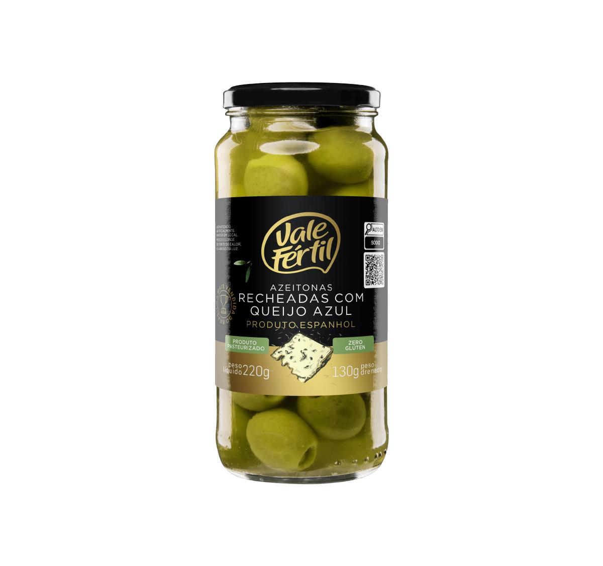 Ideal para ser servida como aperitivo em ocasiões especiais, a Azeitona Verde Recheada com Queijo Azul Vale Fertil