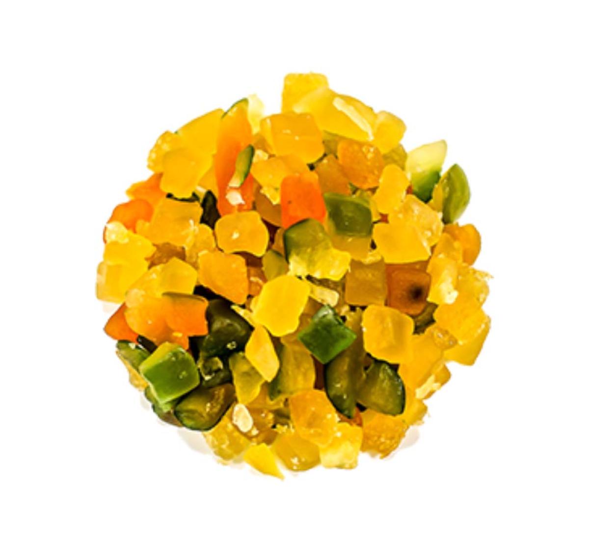 ✅ Mix de frutas cristalizadas em cubos, com cores vibrantes