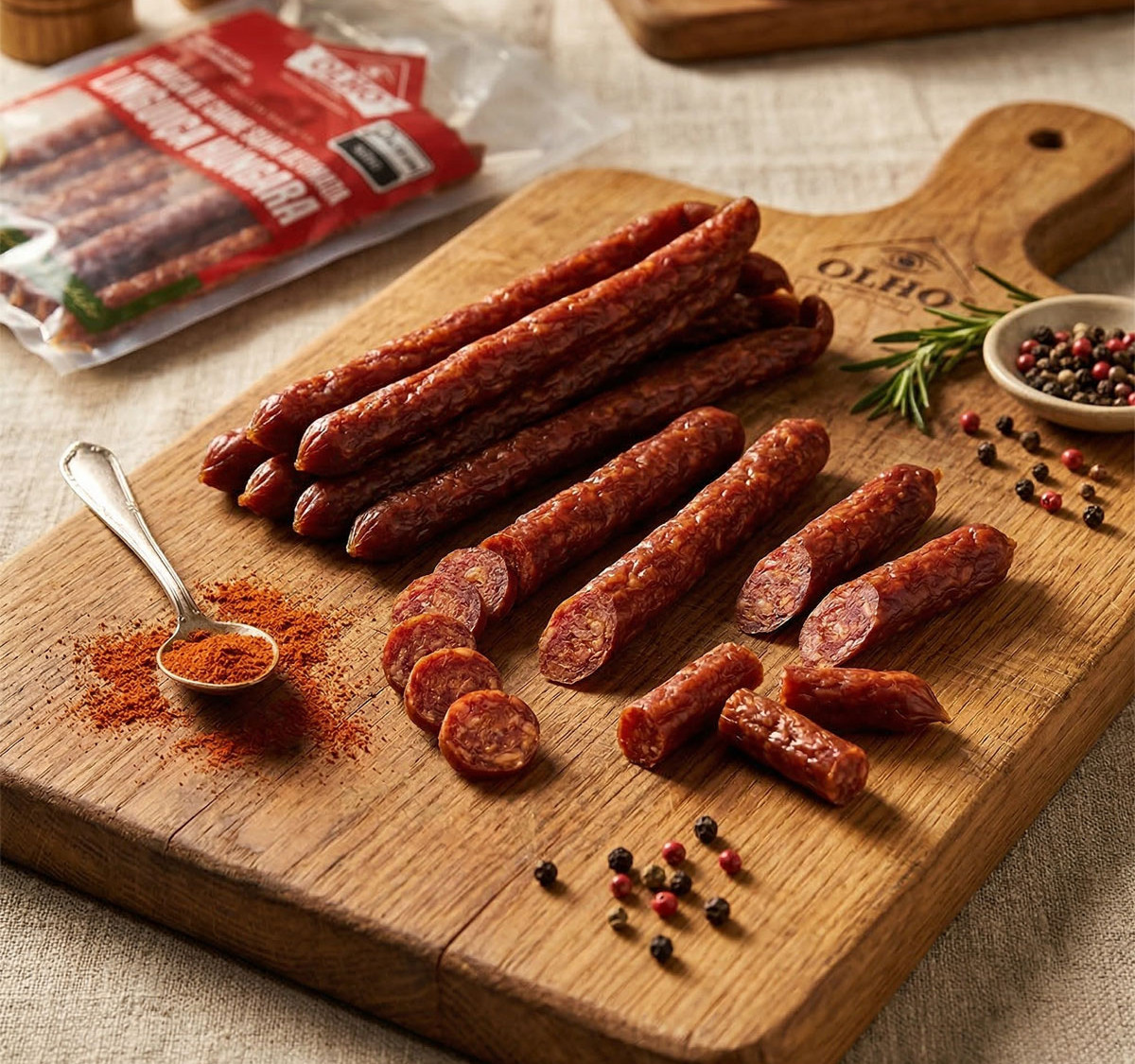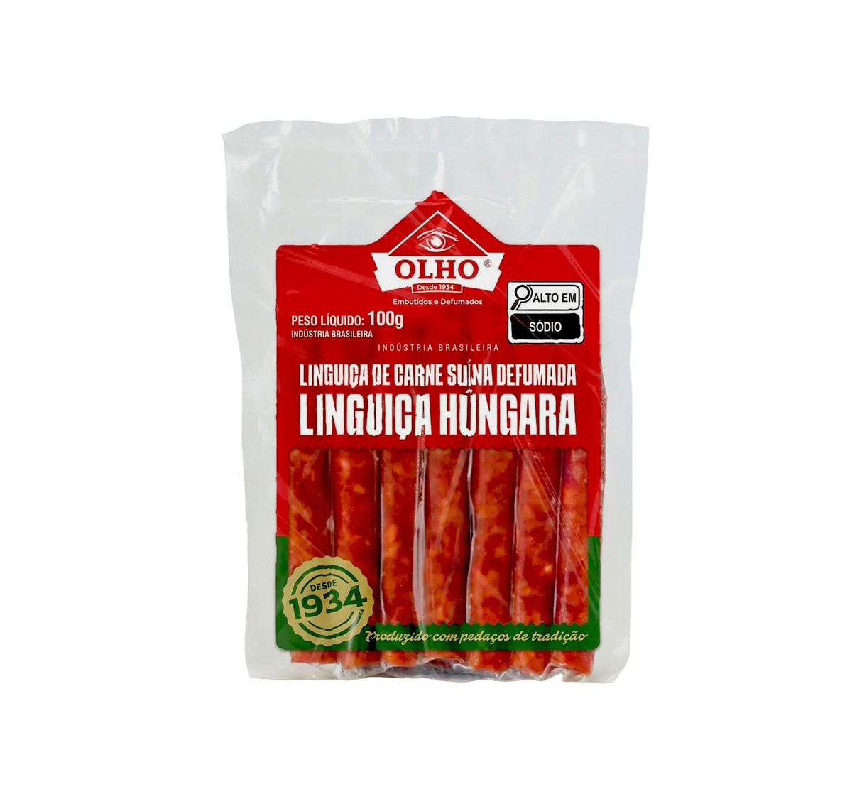 Linguiça Hungara a Vacuo Com sabor diferenciado pelo tempero apimentado, a Linguiça Húngara é ideal para aperitivos. Produzida com selecionadas carnes, pernil e toucinho suíno, o produto respeita a formulação original, trazida pelos colonizadores alemães. O selo SISBI (Sistema Brasileiro de Inspeção de Produtos de Origem Animal – do Ministério da Agricultura). Para receber o SISBI, a Olho passou por uma série de auditorias em sua produção, permitindo assim que os produtos da Olho Embutidos e Defumados sejam comercializados em todo território nacional.