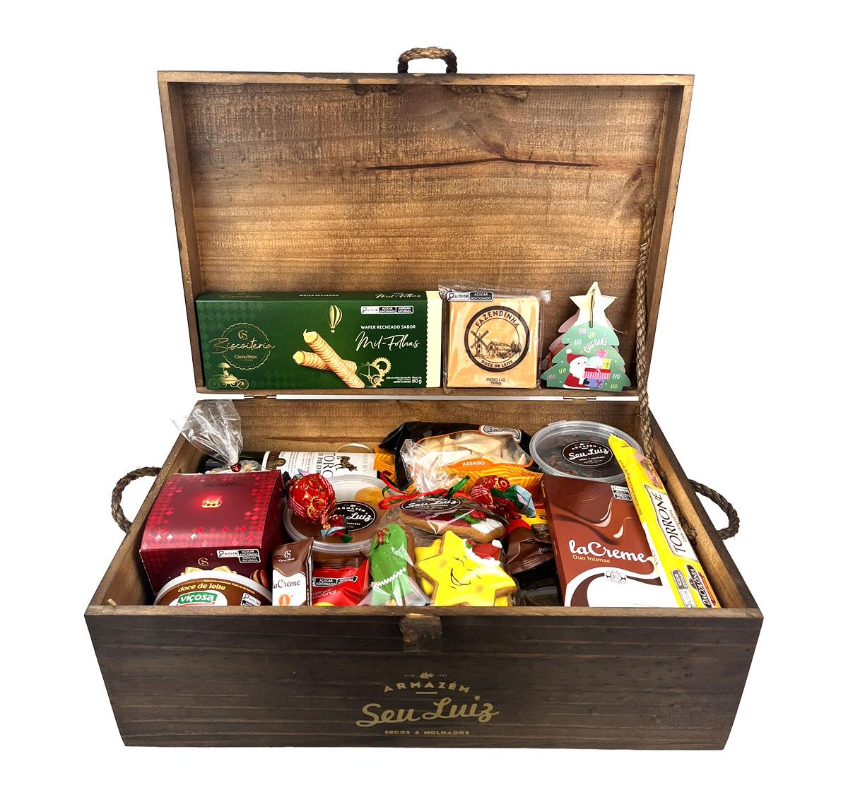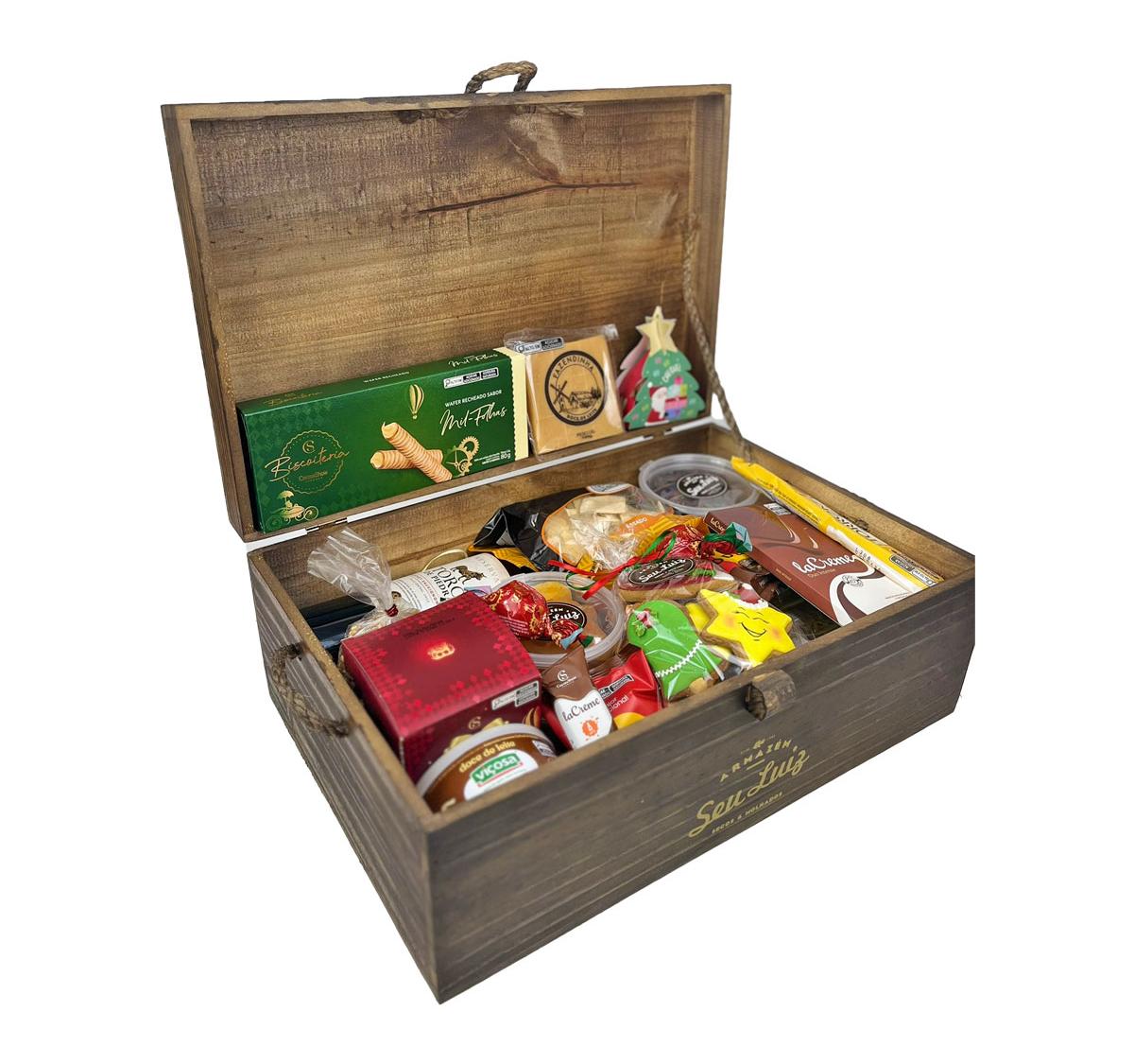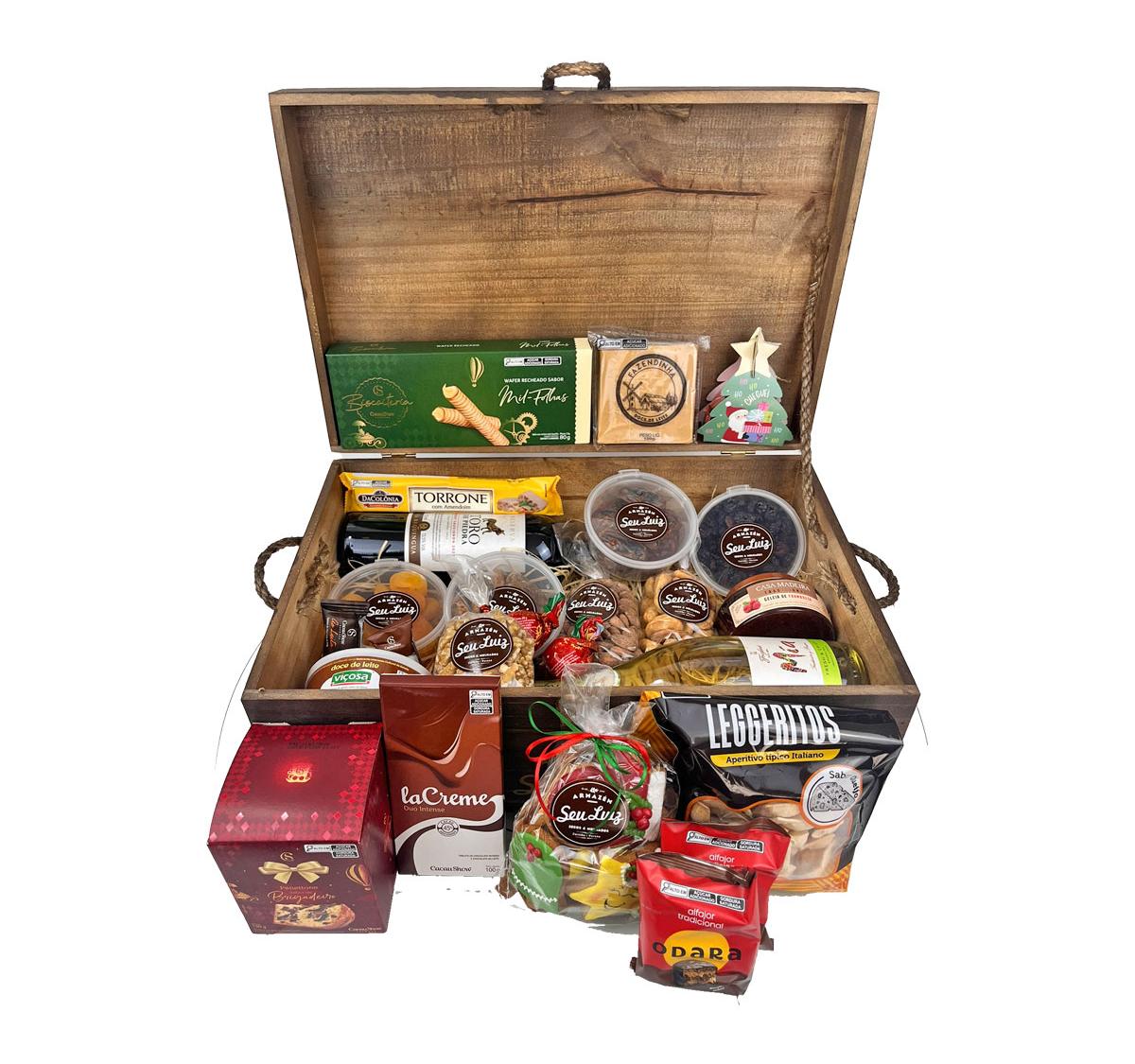 Todos os itens são organizados cuidadosamente em um baú de madeira, que transforma a cesta em um presente sofisticado e marcante — perfeito para surpreender familiares, amigos, clientes e colaboradores.