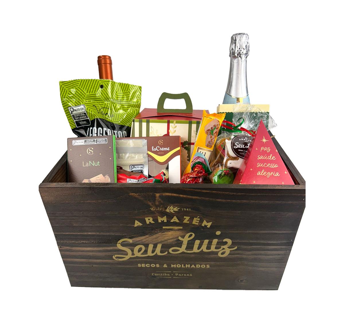 Todos os itens são apresentados em um caixote de madeira, que reforça a proposta artesanal, elegante e exclusiva da cesta.