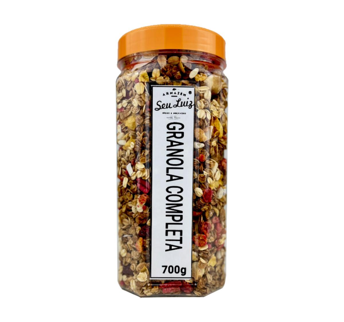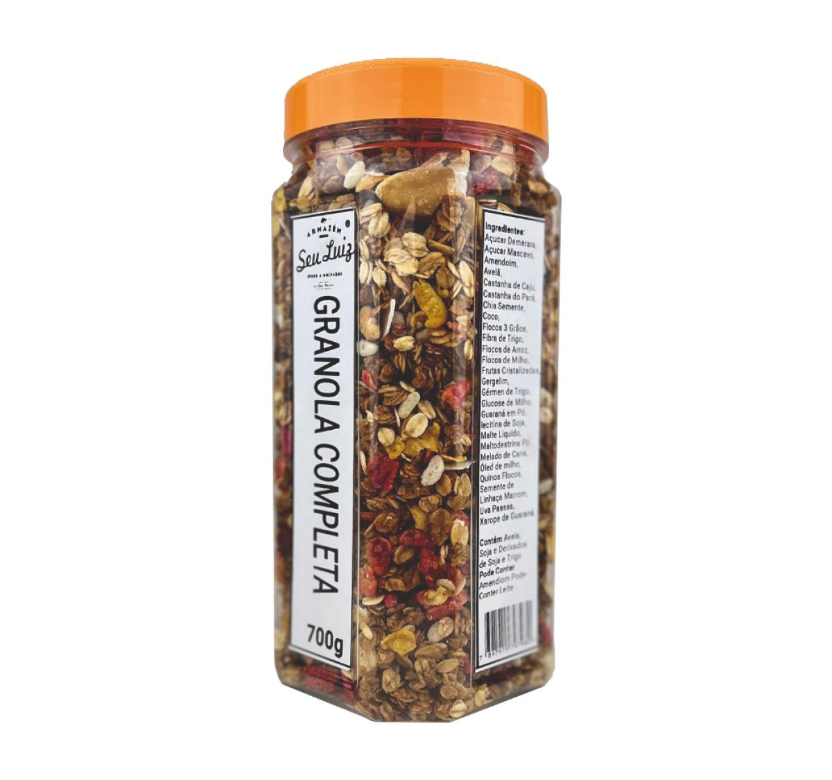 Apresentamos a granola completa Armazém Seu Luiz, uma combinação equilibrada de aveia, frutas secas e sementes, agora disponível em um pote plástico de 700g.