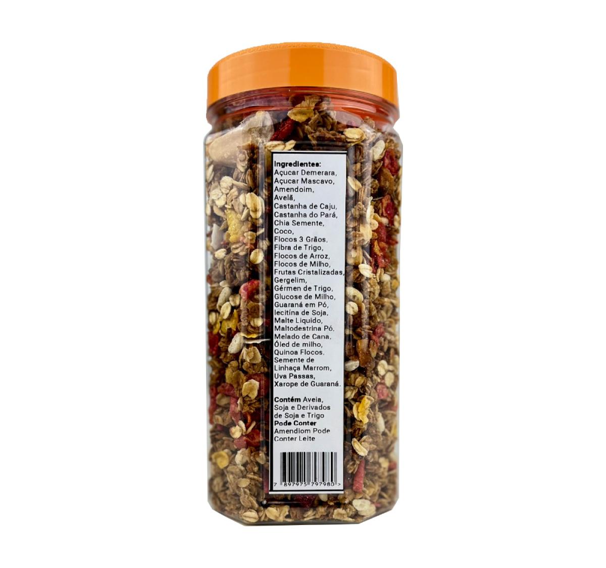 Açucar Demerara, Açucar Mascavo, Amendoim,Avelã, Castanha de Caju, Castanha do Pará, Chia Semente, Coco, Flocs 3 Grãos, Fibra de Trigo, Flocos de Arroz, Flocos de Milho, Frutas Cristalizadas, Gergelim, Gérmen de Trigo, Glucose de Milho, Guaraná em Pó, lecitína de Soja, Malte Liquido, Maltodestrina Pó, Melado de Cana, Óled de milho, Quinoa Flocos, Semente de Linhaça Marrom, Uva Passas, Xarope de Guaraná.
