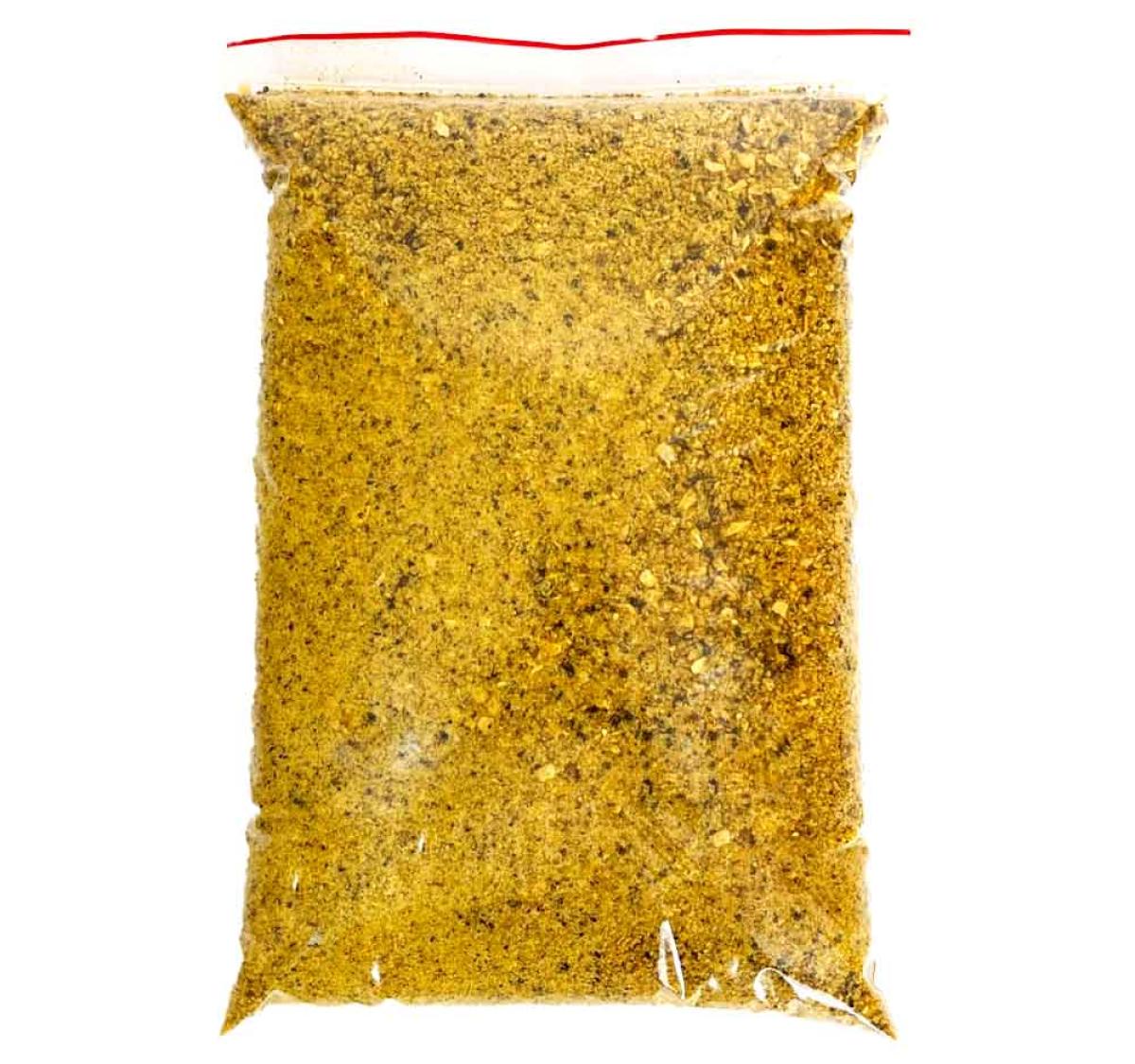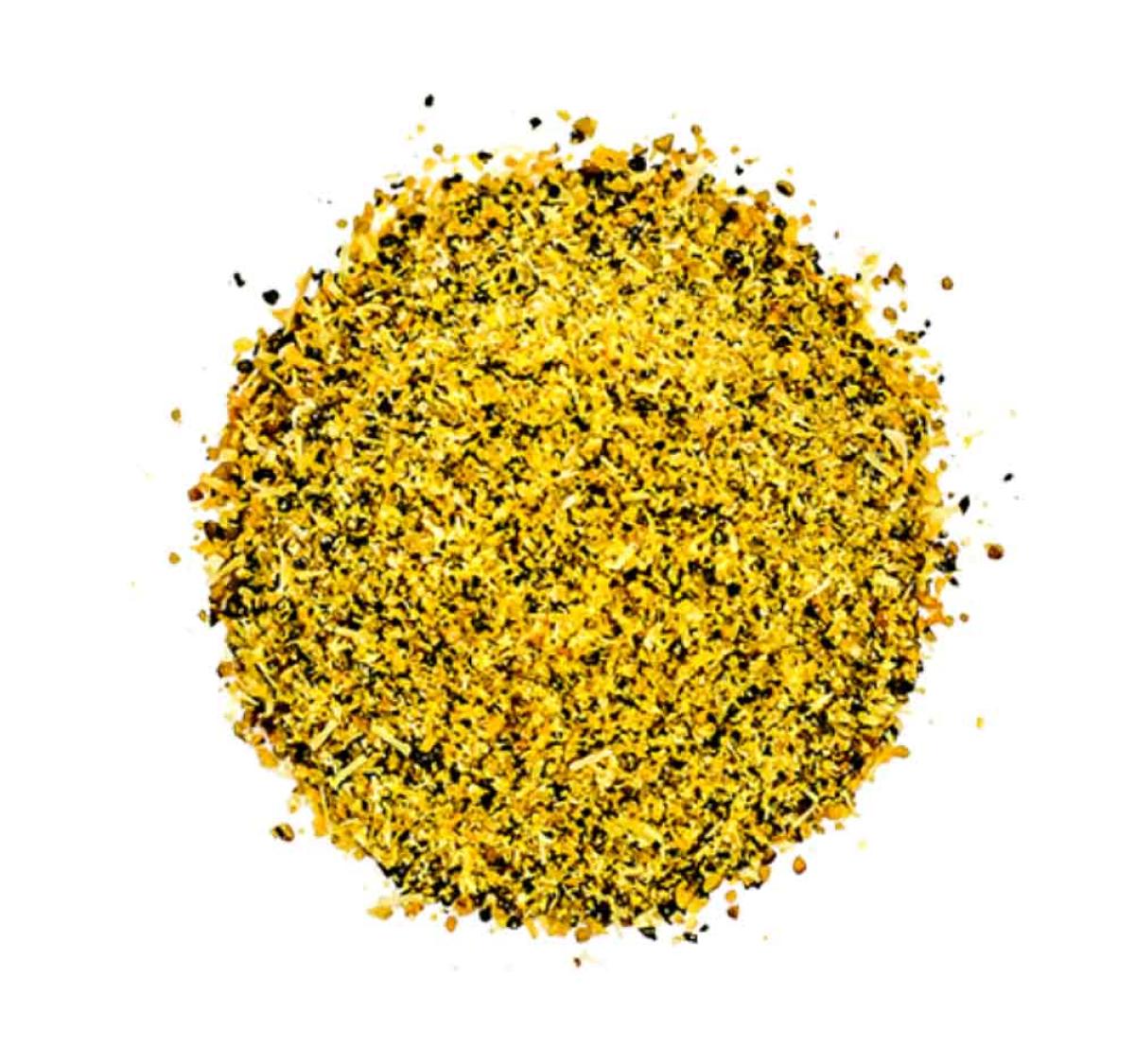 De cor amarela com pontos pretos visíveis, é composto por uma mistura homogênea de limão, pimenta-do-reino, cúrcuma, especiarias e sal marinho, ideal para realçar o sabor de carnes brancas, peixes, legumes, saladas, grelhados e batatas.