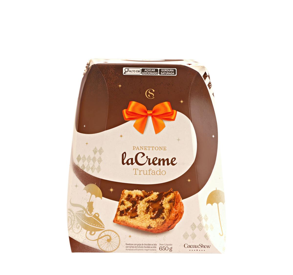 O Panetone laCreme Trufado Cacau Show 650g é uma das versões mais desejadas da marca, combinando a massa macia do panetone tradicional com o irresistível recheio trufado laCreme, famoso por sua cremosidade e sabor marcante de chocolate ao leite.