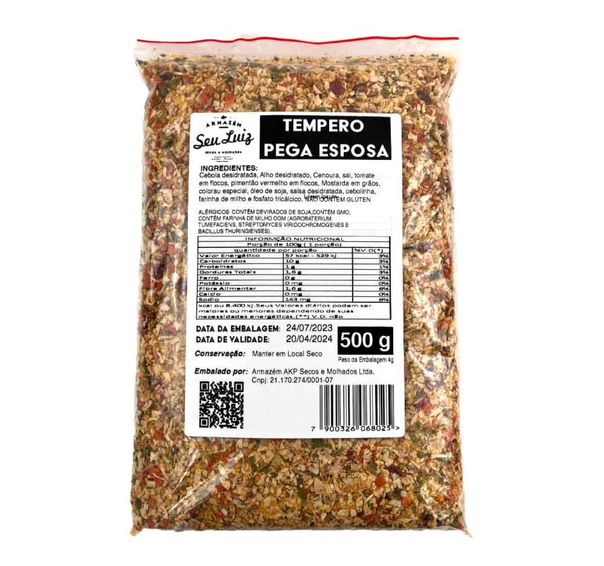 O Tempero Pega Esposa 500g Armazém Seu Luiz é uma mistura especial de especiarias e vegetais desidratados que traz praticidade e muito sabor para sua cozinha. Elaborado com cebola, alho, tomate em flocos, pimentão vermelho, cenoura, mostarda em grãos e salsa desidratada, combina o frescor natural dos ingredientes com a intensidade do colorau especial, resultando em um tempero completo e versátil.