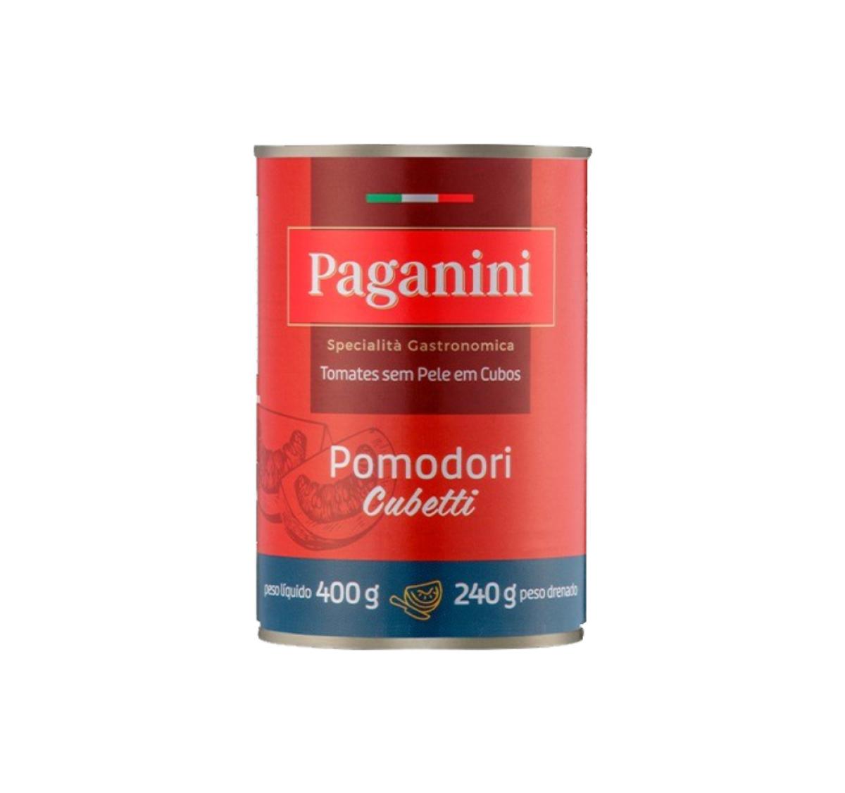 O Tomate Pelado Italiano em Cubos Paganini 400g é preparado na Itália com tomates frescos, colhidos no ponto certo de maturação e cortados em cubos, preservando o sabor autêntico e a praticidade no preparo.