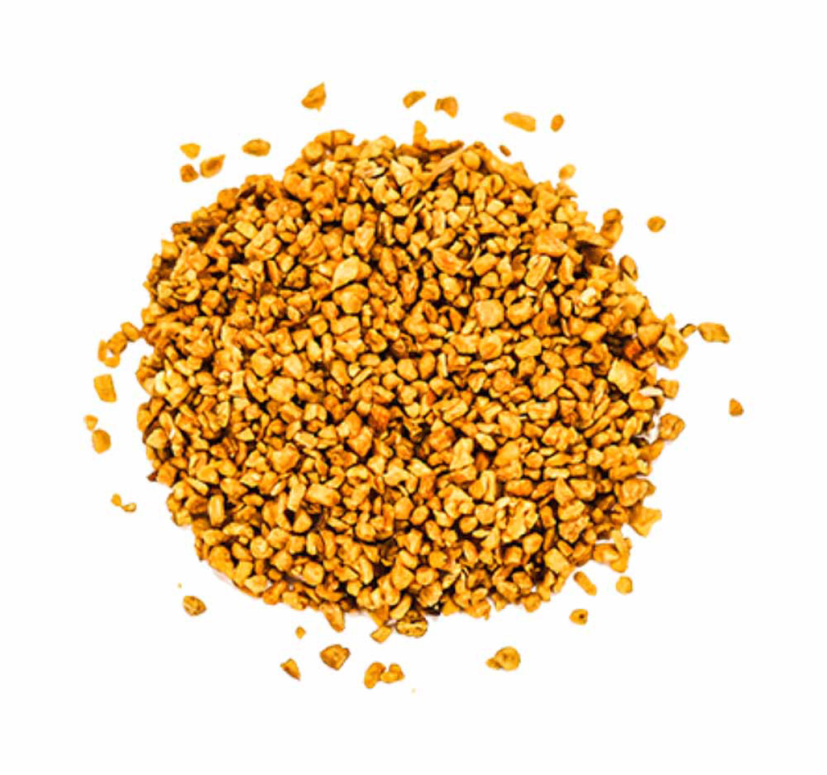 Ele é feito a partir de dentes de alho frescos que são descascados, cortados em pedaços pequenos e, em seguida, submetidos a um processo de desidratação cuidadoso, resultando em grânulos dourados e crocantes.