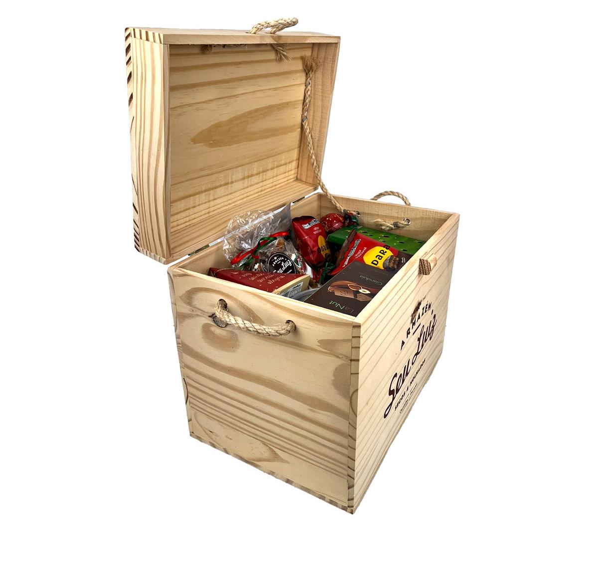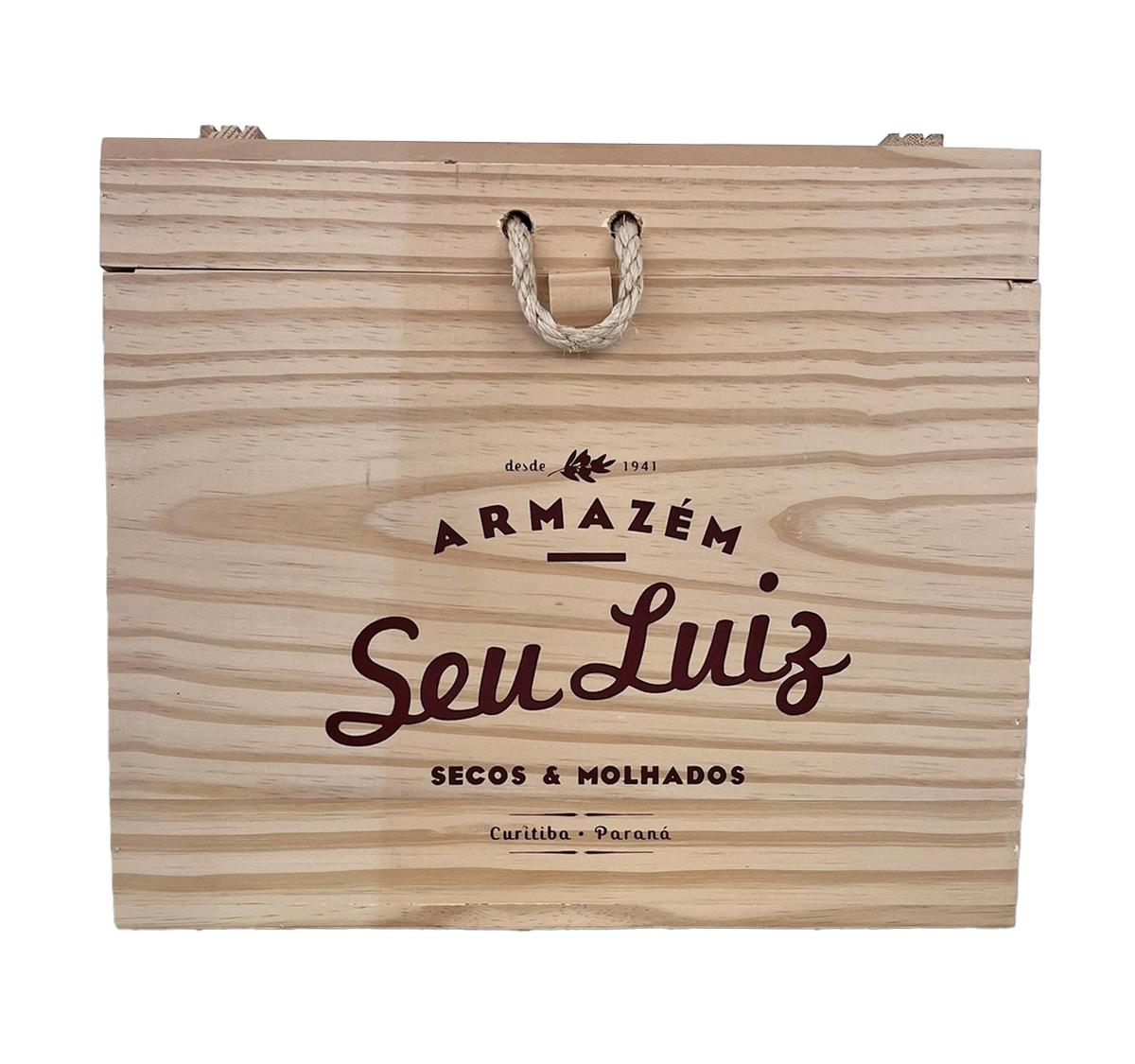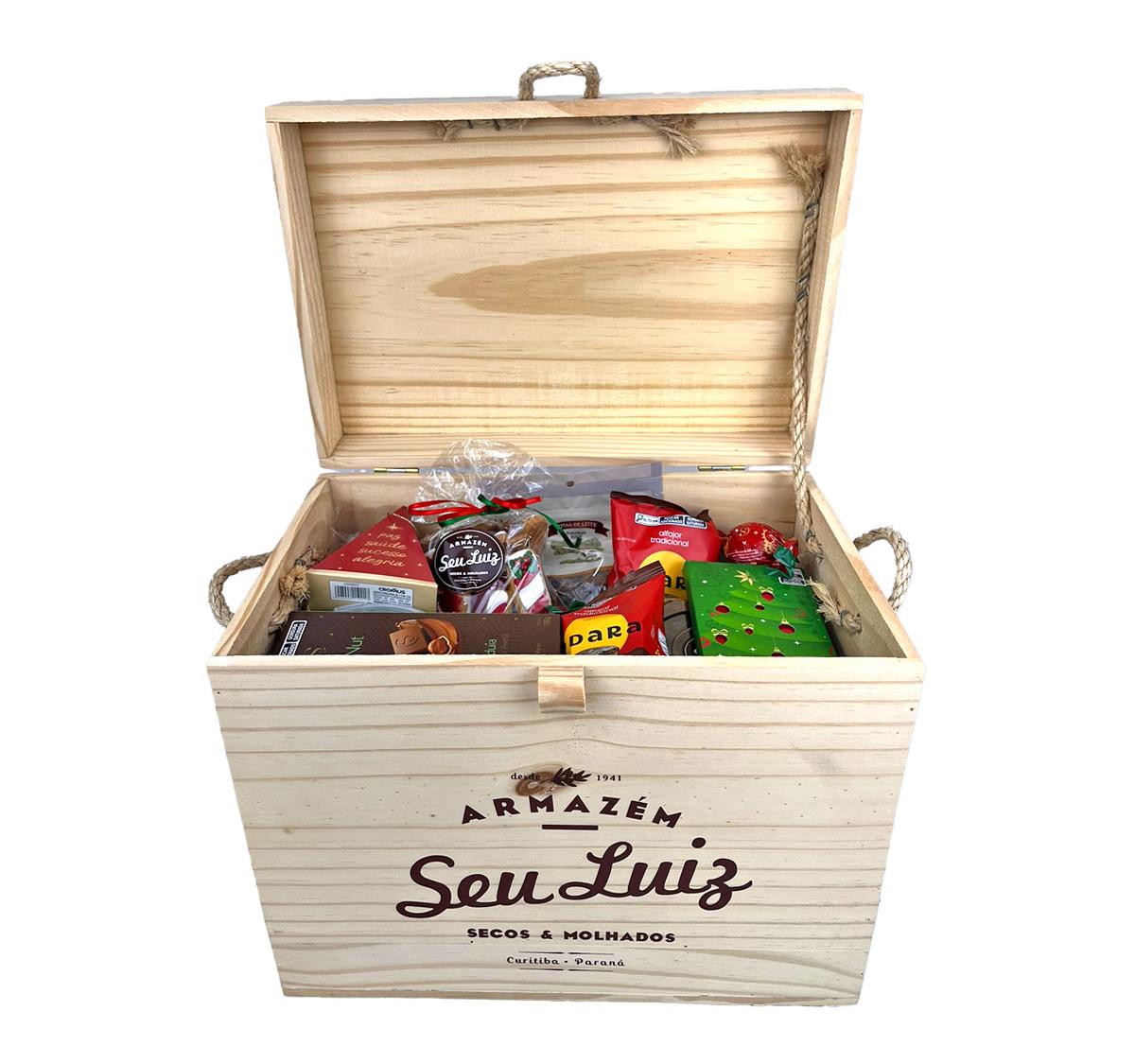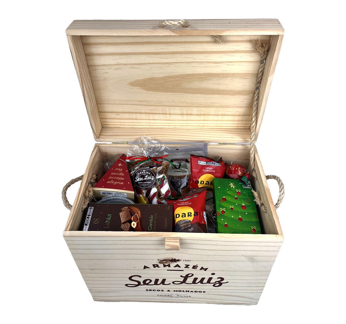 Todos os itens são cuidadosamente organizados em um baú de madeira alto, que agrega sofisticação, presença e excelente apresentação — perfeita para presentear clientes, colaboradores, amigos e familiares.