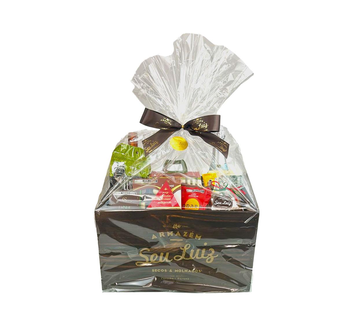 Todos os itens são apresentados em um caixote de madeira, que reforça a proposta artesanal, elegante e exclusiva da cesta.