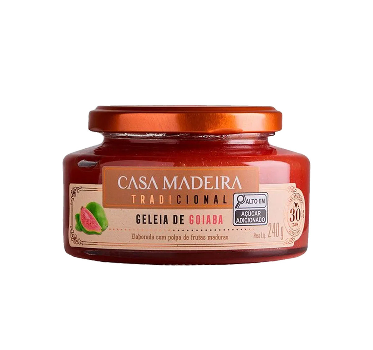 A Geleia de Goiaba Tradicional Casa Madeira 240g é produzida com frutas selecionadas e um cuidadoso processo de preparo que preserva o sabor natural da goiaba.