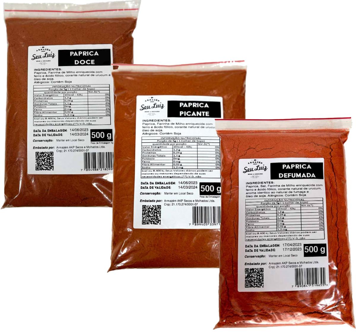 Kit com três tipos de páprica premium: doce, picante e defumada, em embalagens de 500g. Ideal para churrasco, carnes, molhos e preparos que exigem cor, aroma e sabor marcantes. Uso doméstico e profissional