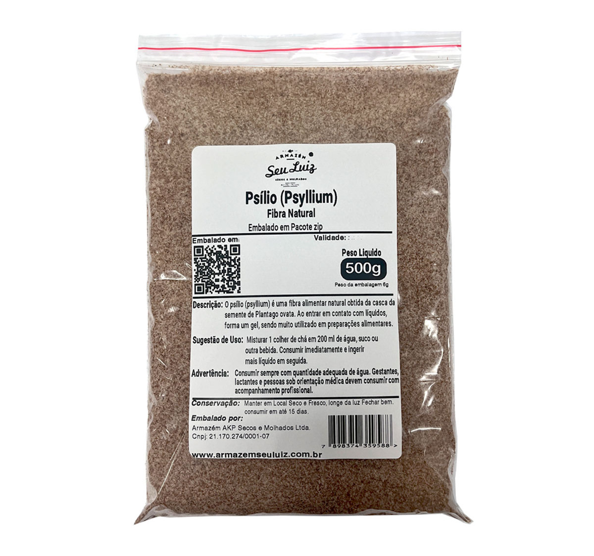 O Psílio (Psyllium) 500g – Armazém Seu Luiz é uma fibra alimentar natural obtida da casca da semente de Plantago ovata. Conhecido pela alta capacidade de absorção de água, forma um gel quando hidratado, sendo amplamente utilizado em preparações alimentares.