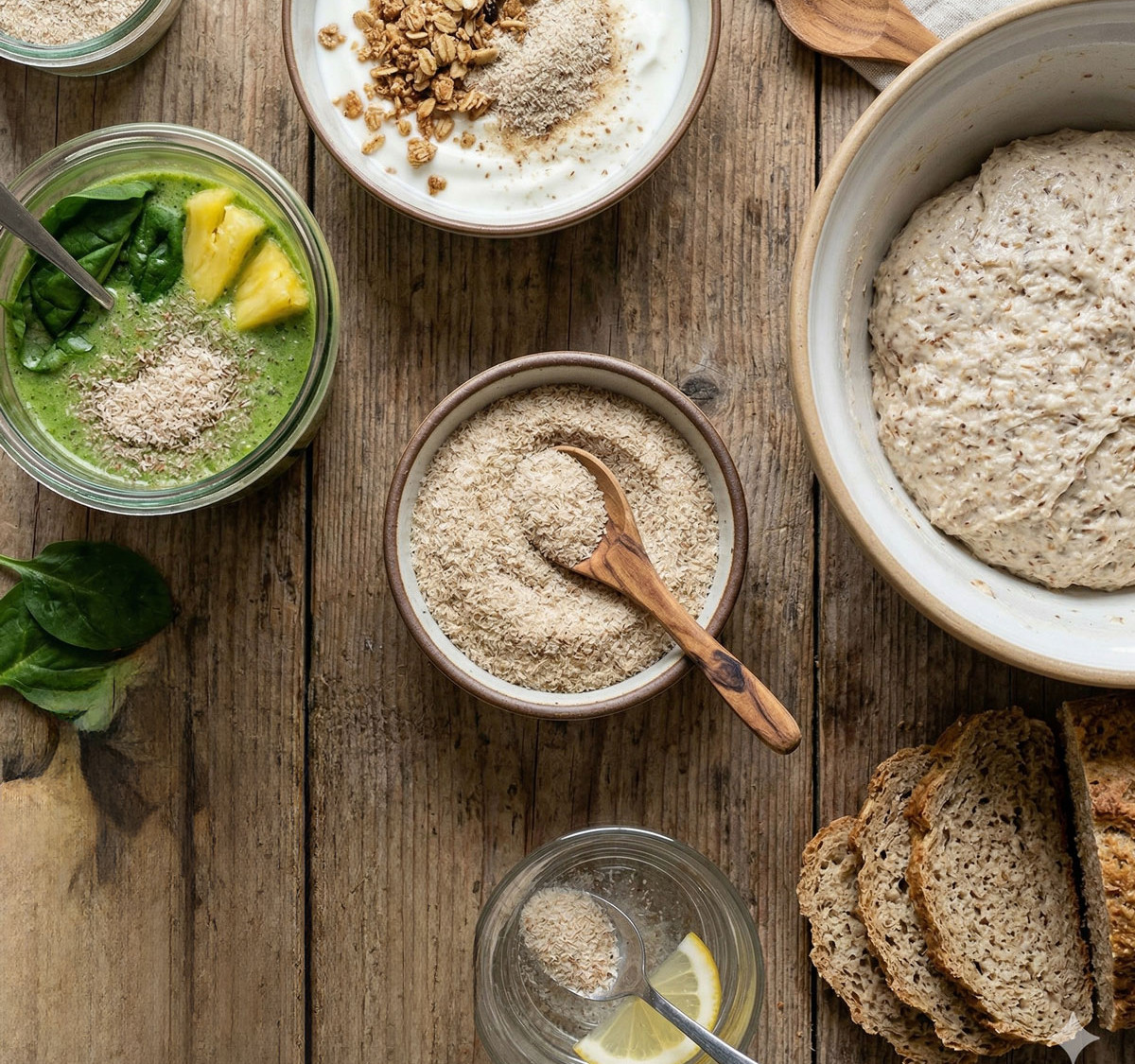 Versátil e prático, o psyllium pode ser incorporado em sucos, vitaminas, iogurtes e receitas como pães, bolos e massas, contribuindo para textura e consistência das preparações.