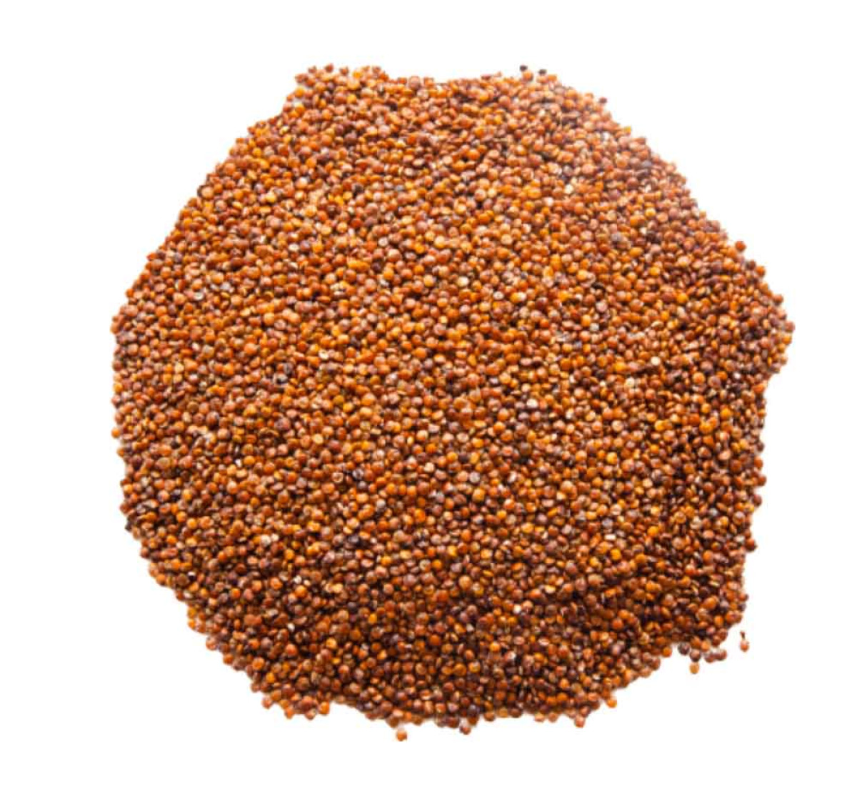 As sementes de quinoa vermelha são pequenas e arredondadas, com uma cor que varia de rosa-claro a vermelho-escuro após o cozimento. Sua aparência é visualmente atraente e acrescenta uma bela tonalidade aos pratos.